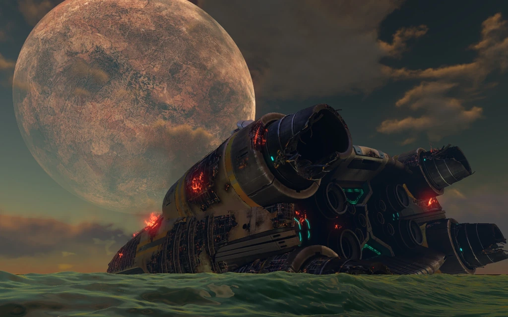 Abgestürztes Raumschiff, in dessen Innerem es einiges zu finden gibt. Dominiert weithin sichtbar den Großteil der Spielumgebung. | |