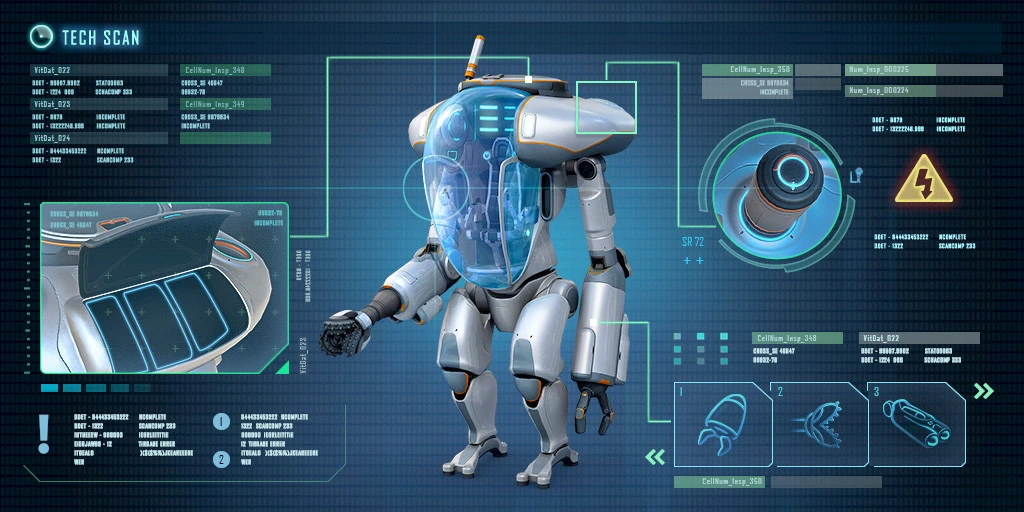 Standardowe wyposażenie do manipulacji środowiska. Przydatny do rozbijania małych skał w poszukiwaniu zasobów lub szybkich ataków, aby odeprzeć drapieżniki. Przedmioty zeebrane są przesyłane do wbudowanego modułu magazynowego. Może być stosowany do jednego lub obu ramion. (Aktywacja przez naciśnięcie odpowiedniego przycisku myszy w PC i Mac lub pociągnięcie odpowiedniego aktywatora w Xbox One) | ||||||||||||||