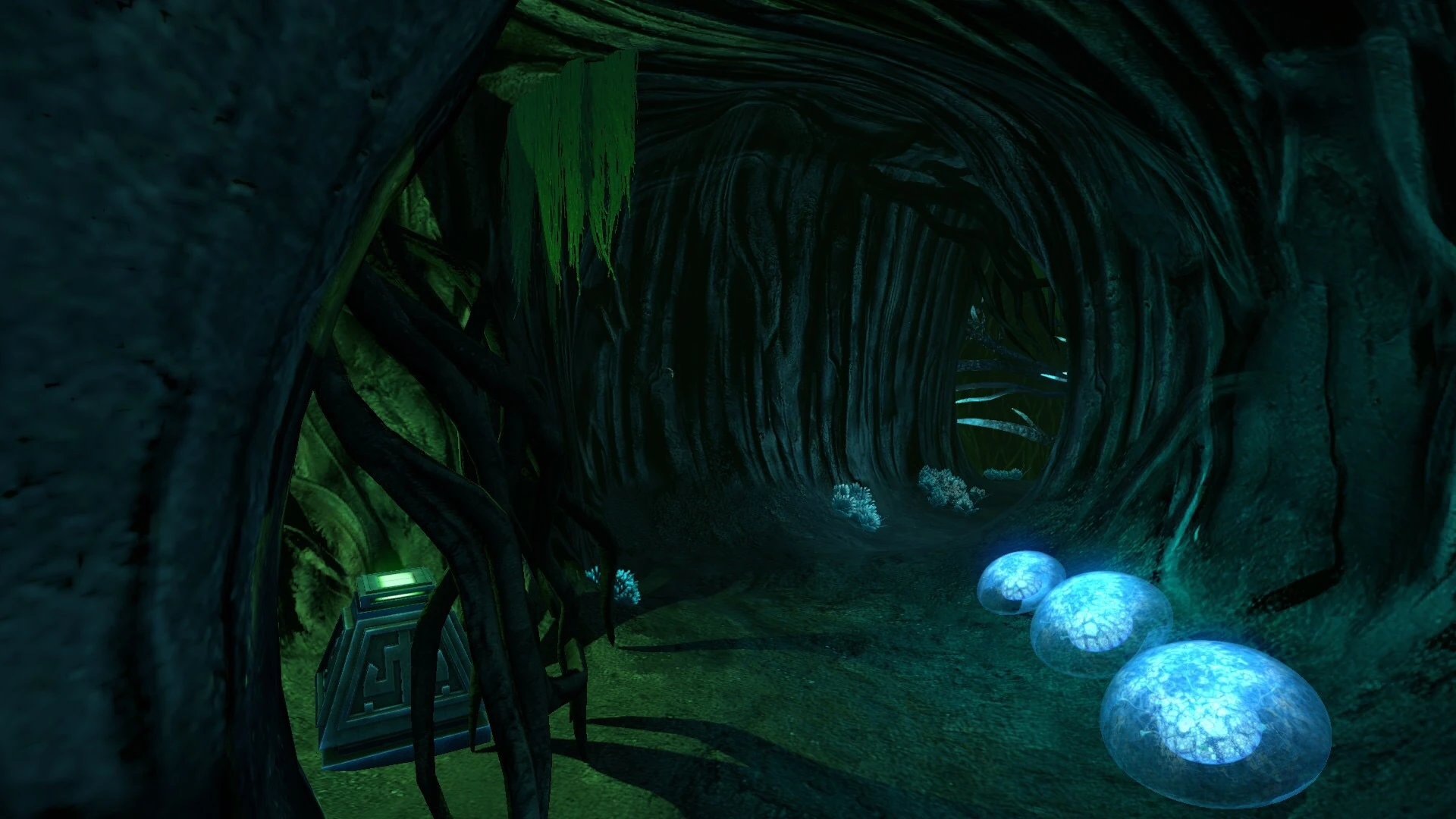 В нём прозрачные хранилища с костями и элементами ландшафта, 3 ионных куба, оборудование и инопланетный терминал данных с записью: