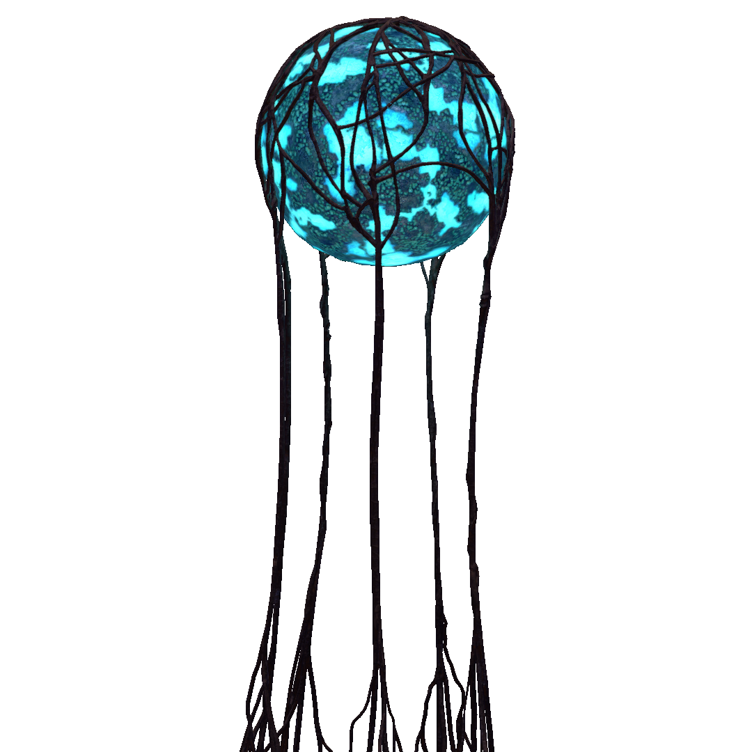 The Anchor Pod is comprised of a suspended blue orb with a jade green pattern on it, held in a maroon colored net of what appear to be its roots.