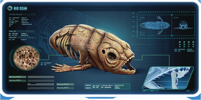 Different species of ray indigenous to 4546B, each adapted to different environments. The specimens are 99.99% genetically identical to those encountered on the planet today, suggesting that rays in particular have undergone little evolutionary mutation in the past millenium. Ghostrays, jellyrays, crimson rays and rabbit rays likely all share a common evolutionary ancestor. The 'alpha ray' would have evolved deep in the ocean trenches, quickly growing in line with available food supplies. It would have most resembled the ghostray in size and appearance, with translucent skin for camouflage and forward-mounted eyes for hunting. A fast and fearsome stalker of small creatures in the dark. While some rays have stayed within the limits of the cave systems where they first evolved, others are relatively more recent adaptations to new environments, likely the results of overpopulation. All of the rays on 4546B have given up predation in favor of herbivorous scavenging, and use poisonous flesh to protect themselves. |