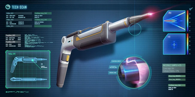 The repair tool can be targeted at any common device - control panels, habitat modules, radios etc. - to stitch wires and seams back together at the atomic level. All good technicians keep one of these under their pillow. Most people don't care why it works, just that it saved their life that one time - but in case you're curious, it combines scanner and fabricator technologies to determine the proper specifications for the targeted object, and then rearranges the available physical material to match the original specs. "The Alterra Repair Tool: Get your fix." |