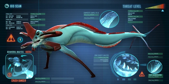 The emperor specimen's eggs are attached to some form of incubator. In a normal life cycle it seems likely that sea emperors would have buried their eggs in shallower waters, where different organic materials in the soil would have triggered a hatching response. The incubator suggests the aliens had resorted to developing artificial hatching enzymes which would simulate the eggs' natural hatching environment, but were unable to discover the formula. With extensive information on the sea emperors themselves it may still be possible to fabricate an artificial hatching enzyme using indigenous ingredients, however the only surviving source of that information may be the sea emperor itself. |