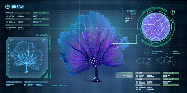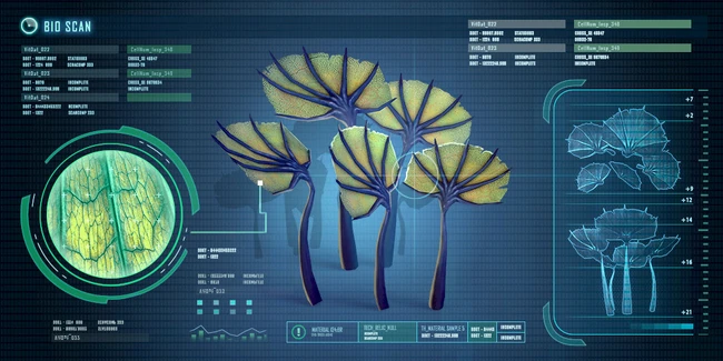 A vast tree encountered in a deep cove, and the only one of its kind encountered on the planet. The tree is surrounded by rays grazing on its pink outer leaves. 1. Bark: 2. Ghost Leviathan Eggs: This tree appears to be an ancient nesting ground. The eggs were laid when the tree was young, and now the branches protect and grow with them as they await the right conditions to hatch. |