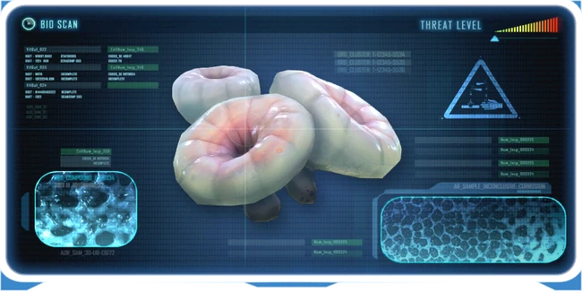 Parasitic, fungus-like growth found attached to other lifeforms. An enzyme is released by the organism which dissolves a hole in the skin of the host, from which it leeches nutrients directly. Outer, tooth-lined jaw serves no identified purpose. May be used during a different stage of the organism's lifecycle. Assessment: Exploitable fungal enzymes |
