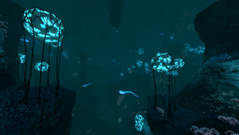 Though it lacks the Membrain Trees found in the Grand Reef, it shares the same Anchor Pods. The Deep Grand Reef is considerably more dangerous than the Grand Reef as it is home to many Crabsquids, capable of disabling electrical devices such as Flashlights, seabase, and vehicles for a short amount of time. Crabsquids are also noted by the PDA as an “unusual energy signature”.