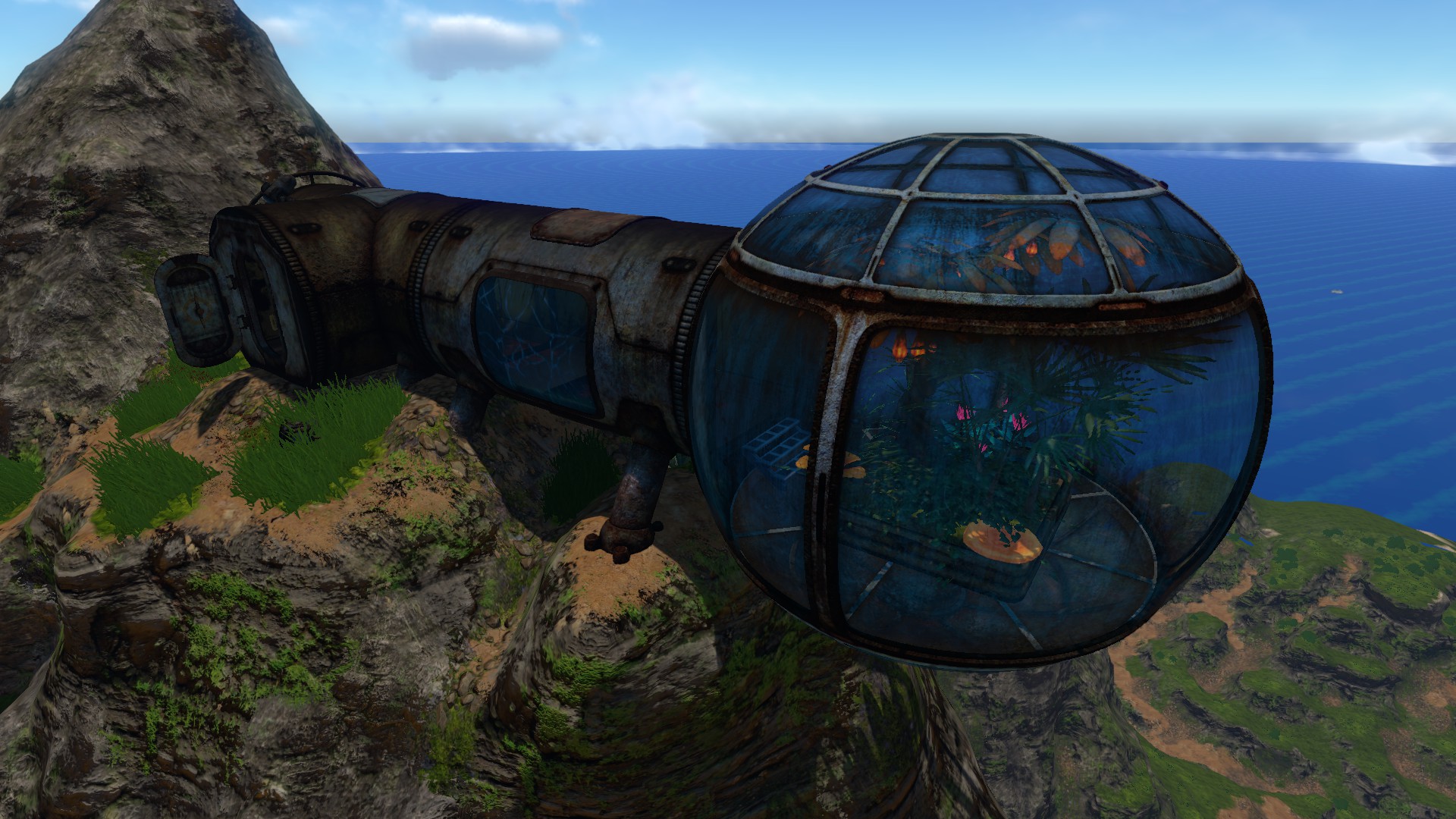 The Degasi crew built the central main base first, later adding the observatories to allow Bart Torgal to study the environment. Under Bart's guidance, they constructed a small farm on the east of the island, consisting of several exterior growbeds which were stocked with Marblemelons and Chinese Potato Plants. At some point Bart appears to have repurposed one of the Observatories as an ersatz greenhouse, with an Interior Growbed placed inside it.