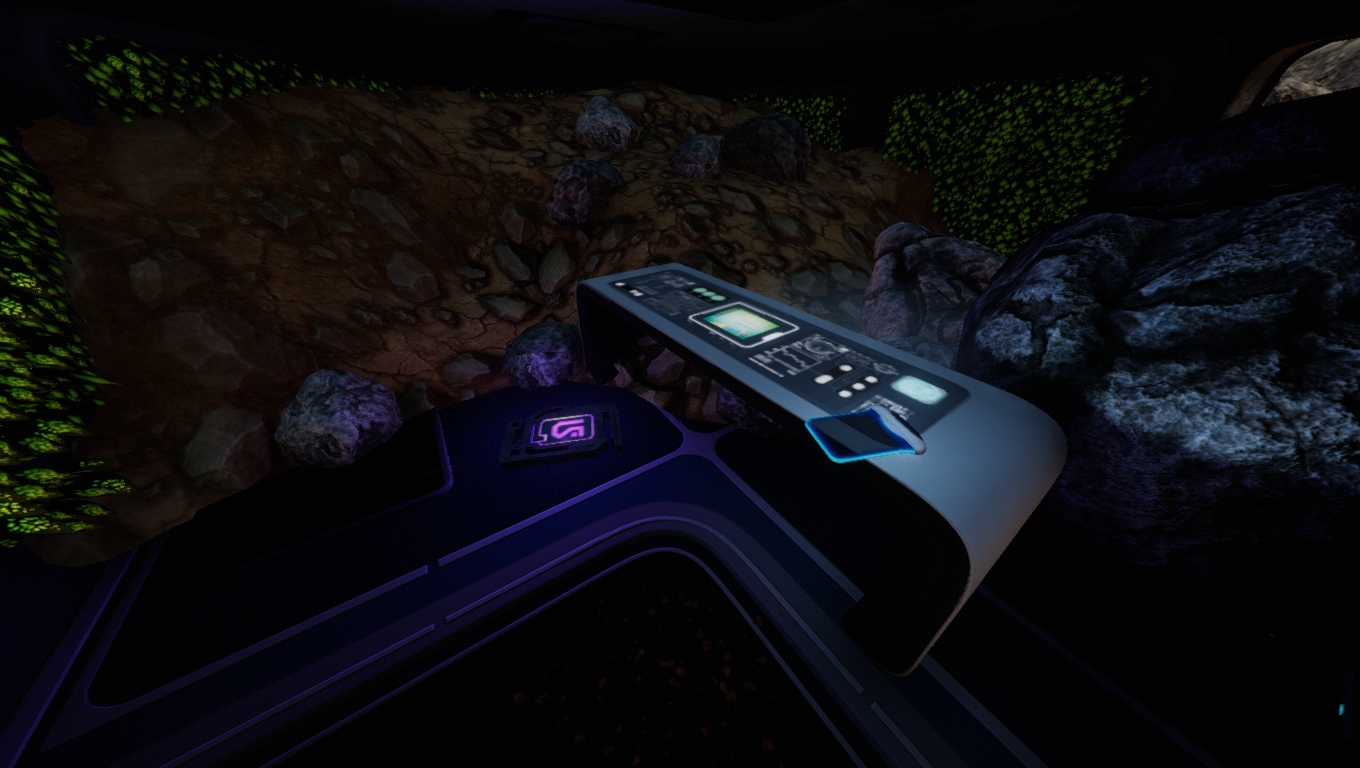 Inside the Multipurpose Room there is an abandoned PDA on the desk and a Purple Tablet beside it. The room also contains wall planters. The path to its hallway is blocked by a boulder, so it can only be accessed via a broken window.