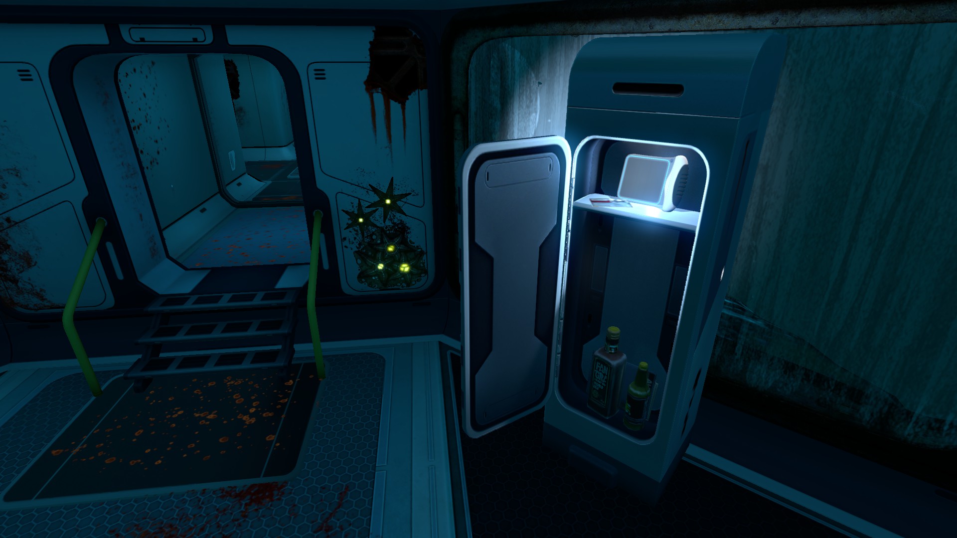 The lower section has many Windows, one Desk and two Beds. Next to the Beds are Lockers, and above one Bed is a Picture Frame. On this bed is a Data Box containing the Swim Charge Fins blueprint. On the desk, a bunch of scattered bottles of spirits and an Abandoned PDA can be found.