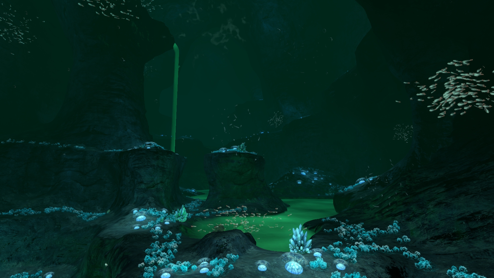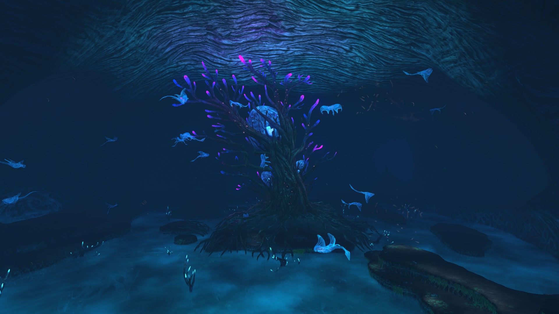 One end of the cavern opens to the northern passage leading to the Junction, and the other, behind the tree, spirals downwards, leading to the Inactive Lava Zone Corridor. Roots and branches grow scattered on the brine lakes and numerous Ghostrays inhabit the chamber. This part of the Lost River is the safest sub biome in Subnautica. This is because the blue brine does not harm the player, there is only one fauna species (which is passive), and there is no flora which can harm the player besides Deep Shrooms.
